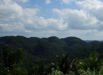 There's hardly a place in Jamaica where you cannot stand and see the hills. They run like a backbone across the centre of the island from west to east, with a myriad of branches extending north and south. Nearly half of Jamaica's surface is over 1000 feet above sea level. The picture above shows the Santa Cruz Mountains as seen from Black River bay.